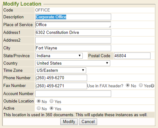 Adding and updating locations can be done using the Update Office Location section. Clients click the here link to edit the primary location of the business. Once this is updated, simply click the Modify button, and the page will refresh the Locations Manager, where additional locations can be added, as needed. This editor may also be accessed by navigating to the Control Panel and selecting the Locations Manager tab.