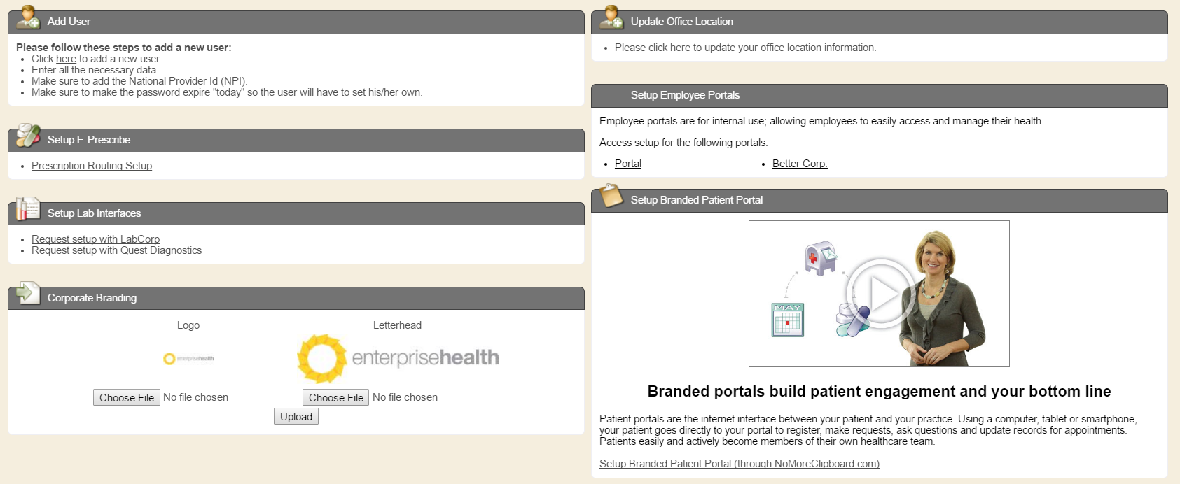 To begin addressing the requirements for effective use of the Enterprise Health system, navigate to the Administrator Welcome section of the Quick View, and click the Admin Get Started link. Here, users are presented with various areas of the system that require initial setup and consideration for configuration.