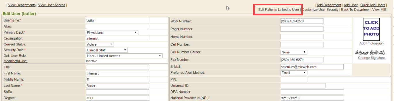 Relationships can be established between charts/users within the Enterprise Health system. This feature is typically used for linking supervisors to employees, but there are many possible relationships that could be defined, as needed. Relationships are typically automated through an HR interface; however, to manually set a relationship, the client may use either the Demographics chart tab or Access Control. From the Edit User screen, click the Edit Patients Linked to User in the upper-right of the page.