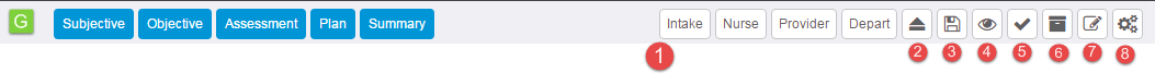G. Encounter navigation toolbar: Displays navigation tabs to skip to different sections while working in an encounter. Hover over the tabs to display the sections that appear under each category.